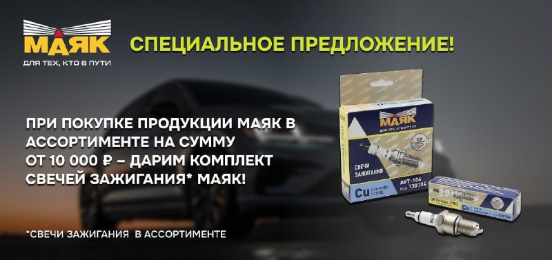 с 3.02 по 27.02.2026г. при покупке автоламп и другой продукци «МАЯК» на сумму от 10 000 рублей — свечи зажигания в подарок!